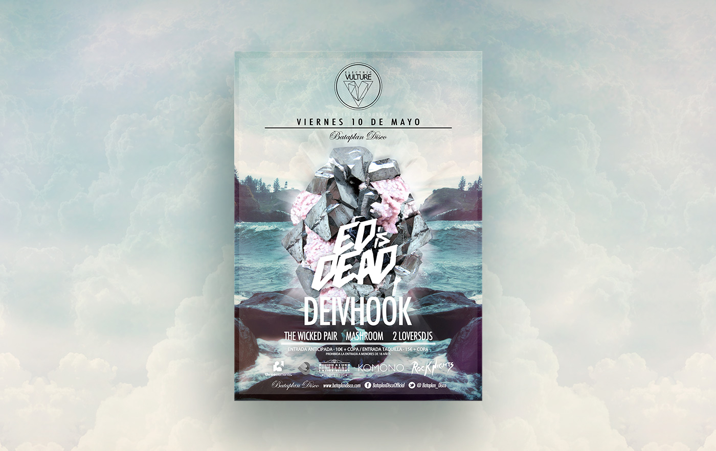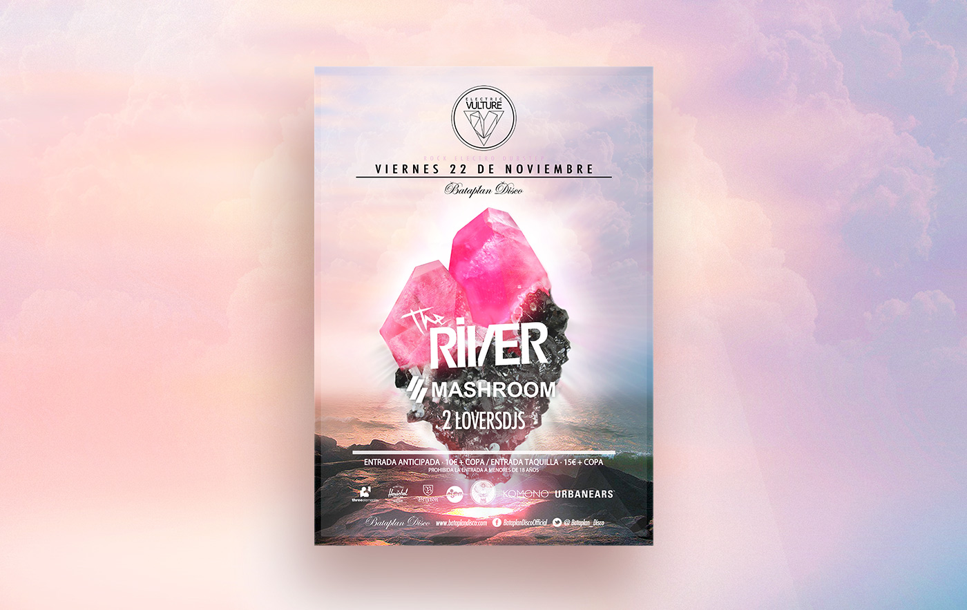 After finished designing process, the mineral must be integrated into the promotion formats for printed posts and online banners. Where the mineral supports the name of the invited artists.